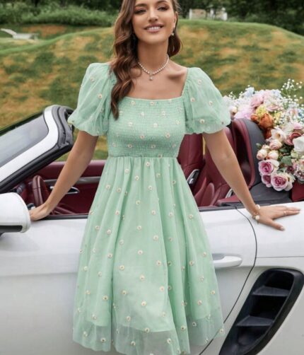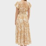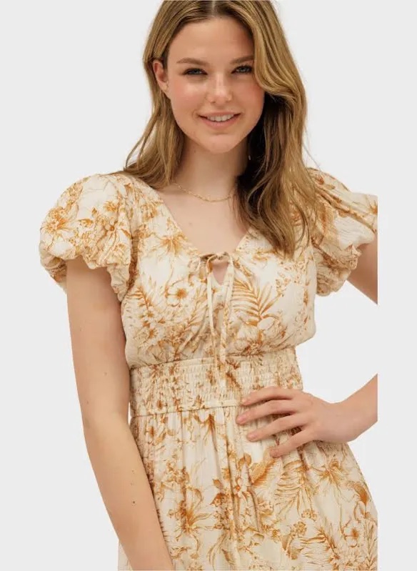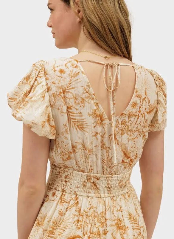 Puffy sleeves sweeten a fit-and-flare midi dress adorned with tropical flowers and finished with a tiered skirt to catch the breeze.